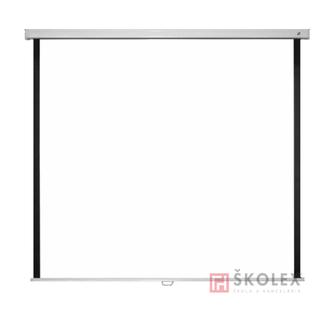 Cenovo výhodná rolovacia nástenná projekčná plocha na školské a prezentačné účely. Oceľový švorcový tubus 65/65 mm bielej farby podľa RAL 9016, bočné krytky tubusu slúžia súčasne na uchytenie na stenu alebo strop. Povrch plátna typ D - matne biely, na textilnej báze, zadná strana čierna. Formát projekčnej plochy 1:1 s bočnými čiernymi okrajmi.