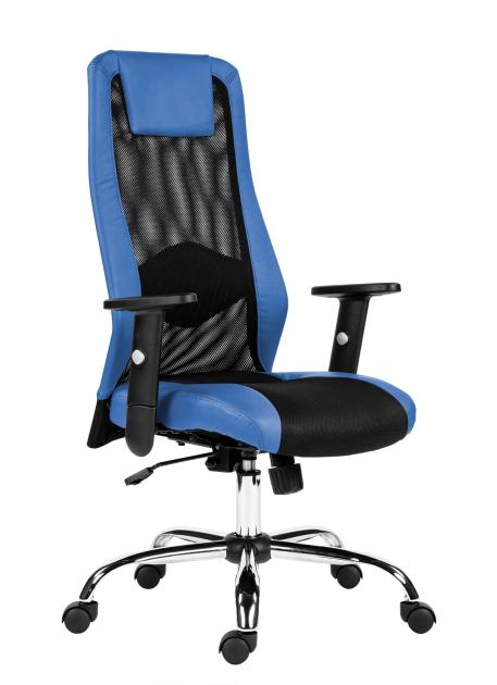 Kancelárska stolička s vysokým, priedušným operadlom s integrovaným podhlavníkom, synchrónny mechanizmus s aretáciou v ľubovoľnej polohe a nastavenie sily protiváhy, čalúnená bedrová opierka, oceľová chromovaná báza, kolieska priemeru 50mm pre mäkké povrchy (koberec, linoleum), výškovo nastaviteľné podrúčky s mäkkou dotykovou plochou, nosnosť 120 kg, záruka 24 mesiacov.