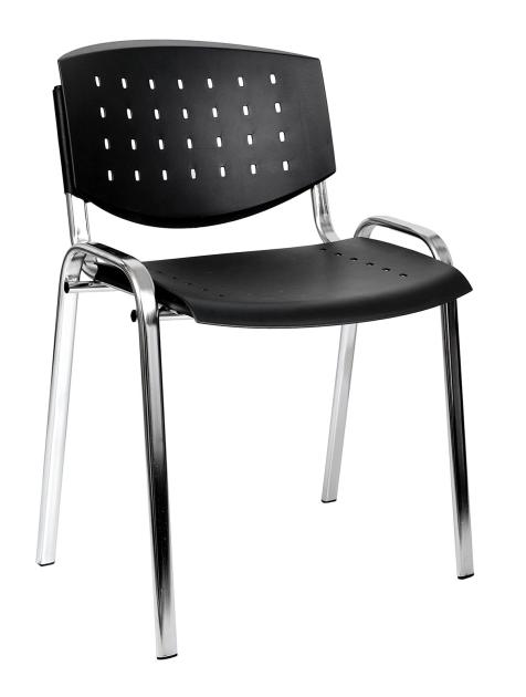 Rokovacia stolička, chrómovaný oceľový rám (profil ovál), s plastovým sedákom a opierkou v odtieňoch P25 červená, P26 čierna, P27 tmavá modrá, P28 slonovinová kosť, P29 tmavá šedá, stohovateľná (max.10 ks), nosnosť 120 kg.
