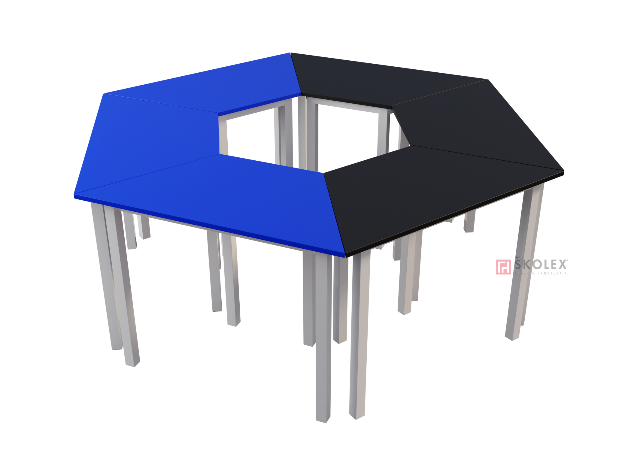 Moderný stôl lichobežníkového formátu 100x50 cm výškovo pevný, podnož z joklového profilu, povrchovo upravená vypalovanou práškovou farbou (výber z RAL vzorkovníka), laminovaná drevotriesková doska hr. 18mm, rôznych dezénov (výber zo vzorkovníka "Farba dosky"). Dostupný vo veľkostiach 3, 4, 5, 6. Vhodný pre skupinové riešenie úloh alebo usporiadanie stolov do "hniezd". Záruka 2 roky.