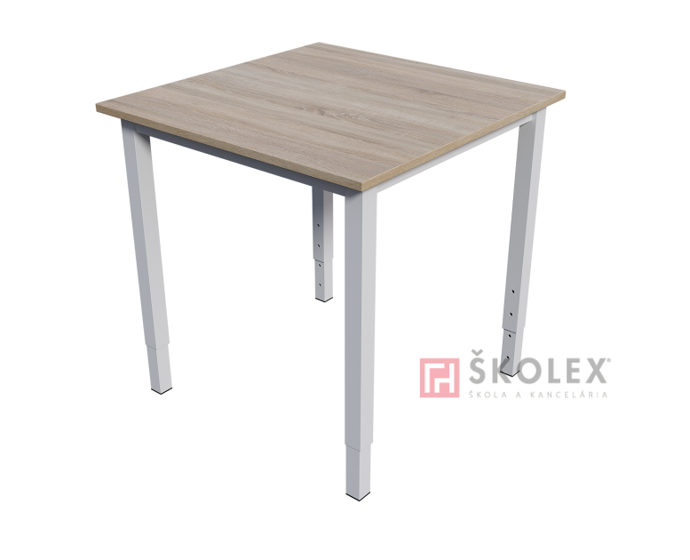 Moderný výškovo nastaviteľný stôl štvorcového formátu 70x70 cm, podnož z joklového profilu, povrchovo upravená vypalovanou práškovou farbou (výber z RAL vzorkovníka), laminovaná drevotriesková doska hr. 18mm, rôznych dezénov (výber zo vzorkovníka "Farba dosky"). Výškové nastavenie 580mm - 820mm (veľ. 3 - 7). Vhodný pre skupinové riešenie úloh alebo usporiadanie stolov do "hniezd". Záruka 2 roky.