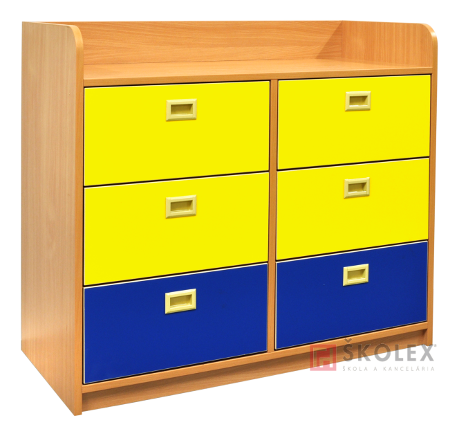 Laminovaná drevotriesková doska hrúbky 18mm, 2mm ABS hrana. Dvierka a čelá zásuviek je možné objednávať aj vo farebných prevedeniach LDTD, korpus len v základných drevodekóroch (buk, dub Sonoma, javor, jelša, čerešňa), antracitovej, čiernej, šedej a bielej farbe LDTD. Madlá sú kvôli bezpečnosti detí zapustené, farba strieborná, bez možnosti farebnej úpravy. Vrchná časť skrinky je riešená ako priestor pre odkladanie knžiek a hračiek. Chrbát skrinky tvorí sololit alebo v prípade ustavenia do priestoru pohľadová LDT doska vo farbe korpusu. Pri ustavení do priestoru umožňujú skrinky optické rozdelenie miestnosti. Za príplatok je možné objednať kolieska ku skrinke.