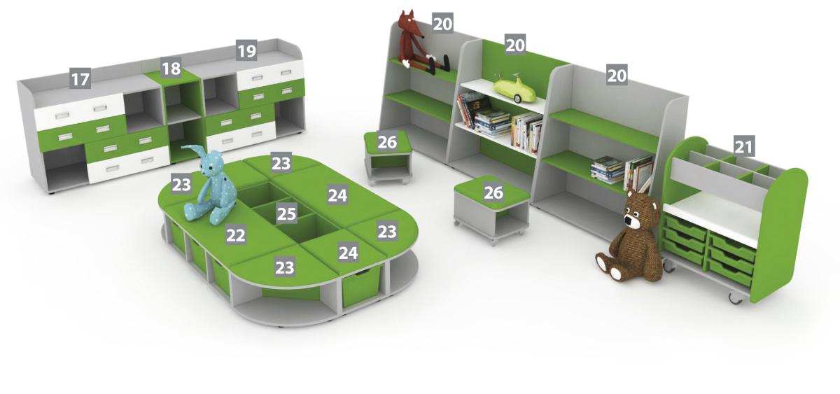 Modelový rad nábytku pre materské školy NELI. Zostava č.3 účelne kombinuje sedací priestor pre deti s úložným priestorom. Zákazník má možnosť výberu vlastnej farebnej kombinácie a usporiadania nábytku podľa svojich predstáv.