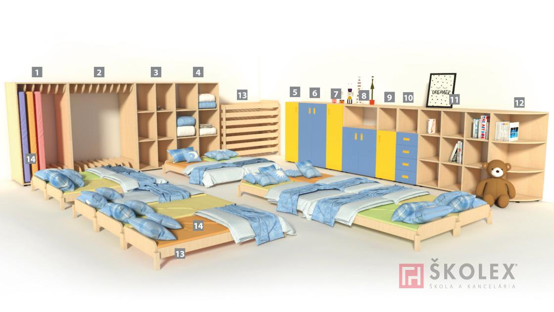 Modelový rad nábytku pre materské školy NELI. Zostava č.4 je funkčnou kombináciou priestoru na spanie a úložného priestoru pre matrace a posteľnú bielizeň. (viac)