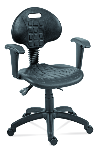 Polyuretánová dielenská stolička, plastová báza s kolieskami (klzákmi), nastaviteľná hĺbka sedadla a výška operadla, uhol operadla pevný, výšková nastaviteľnosť pomocou plynového piestu (viac)