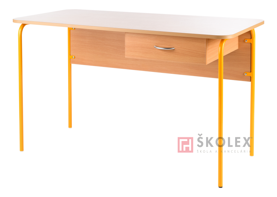 Kovová konštrukcia z rúrkového profilu Ø 22 mm lakovaná práškovými farbami (komaxit – výber z 11 farieb), nohy stola sú ukončené plastovými koncovkami, pri jednej nohe je rektifikačná skrutka na ustavenie stola do stabilnej polohy (vyrovnanie nerovnosti podlahy). Pracovná doska stola 130 x 65 cm a predná ochranná doska 130 x 35 cm je z drevotriesky hr.18 mm, povrch melamín (buk), priskrutkovaná ku konštrukcii 4 metrickými krutkami M6 x 45 mm; hrany dosky stola sú chránené 2 mm ABS hranou, odkladací priestor stola je riešený vysúvateľnou zásuvkou šírky 40 cm na pravej strane stola. K učiteľskej katedre KLASIK je vhodná učiteľská stolička KLASIK čalúnená, školský stôl KLASIK a školská stolička KLASIK.