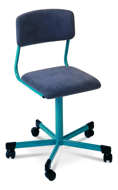 Kovová konštrukcia z rúrkového profilu, so spodným päťramenným krížom z plochooválneho profilu s kolieskami, lakovaná práškovými farbami (komaxit), výber zo vzorkovníka RAL. Sedák a opierka z celobukovej tvarovanej preglejky, čalúnenej oteruvzdornou šedou látkou. Sedáky a opierky prinitované ku konštrukcii oceľovými nitmi priemeru 5 mm. Stoličky nie sú výškovo nastaviteľné, otočné cez kolieska. Veľkosť č. 6, výška sedáku 46 cm.