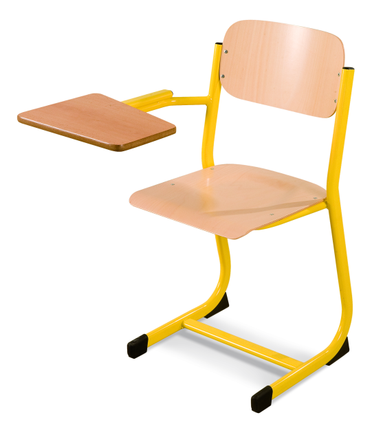 Kovová konštrukcia z plochooválneho profilu 38 x 20 mm lakovaná práškovými farbami (komaxit), výber z RAL vzorkovníka. Nohy stoličky sú ukončené plastovými klzákmi, ktoré tlmia hluk a nepoškodzujú podlahu. Sedák a opierka sú vyrobené zo 7-vrstvovej celobukovej tvarovanej preglejky, povrchovo upravenej kvalitnými polyuretánovými lakmi, prinitované ku konštrukcii oceľovými nitmi priemeru 5 mm. Sklopný pultík je z materiálu MDF. Veľkost č. 6, výška sedáku 46 cm.